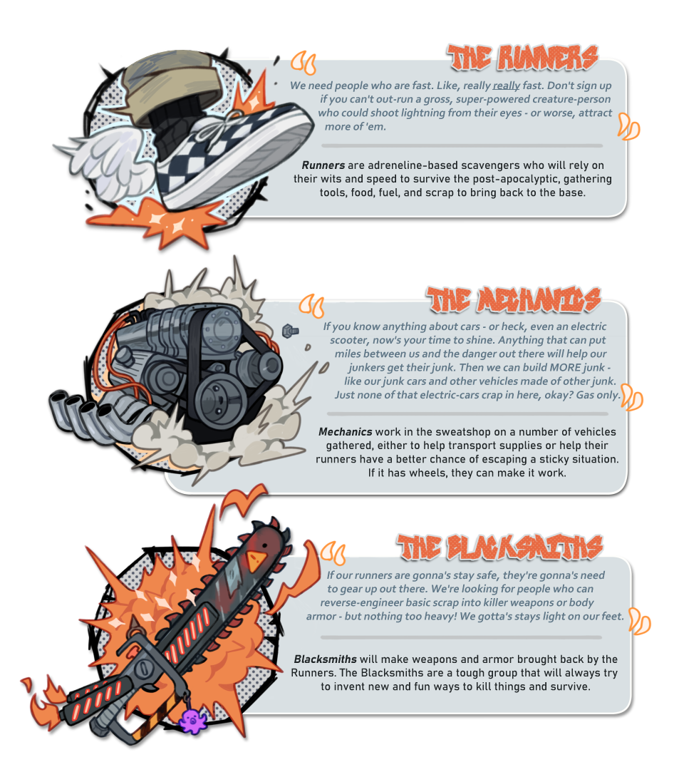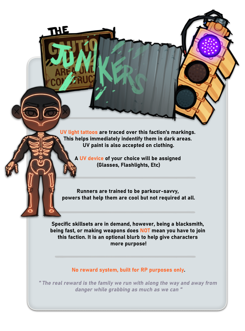 "Why did I create the junkers? Free stuff. Heh, just messing with you, this isn't some trip to the janitor's lost and found - no, this is way bigger. If we're gonna be living in one of those post-apocalypse shows we all grew up watchin' (90's kids, where are you at?),Then we're gonna' have to step it up. It doesn't end at 'gathering supplies', our goal is to take back the city; setting up safe zones, re-building the transportation systems, and, most importantly, clearing threats.The deeper we go into the city, the more dangerous it gets. This isn't a game. That said... Are you with me?"